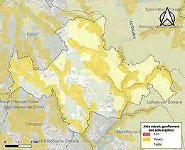 Le retrait-gonflement des sols argileux est susceptible d'engendrer des dommages importants aux bâtiments en cas d’alternance de périodes de sécheresse et de pluie. 39,6 % de la superficie communale est en aléa moyen ou fort (26,8 % au niveau départemental et 48,5 % au niveau national). Sur les 219 bâtiments dénombrés sur la commune en 2019, 66 sont en aléa moyen ou fort, soit 30 %, à comparer aux 36 % au niveau départemental et 54 % au niveau national. Une cartographie de l'exposition du territoire national au retrait gonflement des sols argileux est disponible sur le site du BRGM[20],[Carte 2].