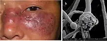 La mucormycose associée à la COVID-19[1], communément appelée « champignon noir » (black fungus)[2], est l'association d'une atteinte de mucormycose (une infection fongique agressive) avec la COVID-19[3]. On la rencontre logée au poumon ou autour du nez, des yeux et du cerveau - une telle manifestation clinique est parfois appelée «mucormycose rhino-orbito-cérébrales (ROC)»[4]. La maladie ne se transmet pas de personne à personne, elle n'est pas contagieuse[5].