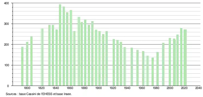 L'évolution du nombre d'habitants est connue à travers les recensements de la population effectués dans la commune depuis 1793. Pour les communes de moins de 10 000 habitants, une enquête de recensement portant sur toute la population est réalisée tous les cinq ans, les populations légales des années intermédiaires étant quant à elles estimées par interpolation ou extrapolation[19]. Pour la commune, le premier recensement exhaustif entrant dans le cadre du nouveau dispositif a été réalisé en 2005[20].