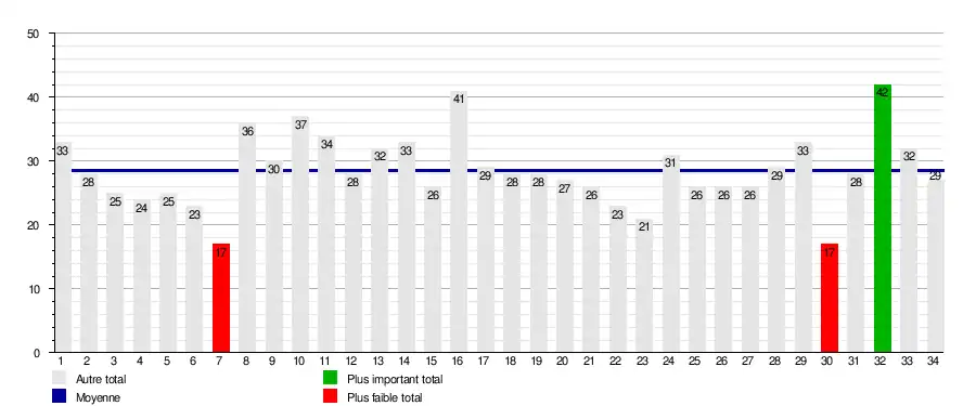 | Journée → | 1 | 2 | 3 | 4 | 5 | 6 | 7 | 8 | 9 | 10 | 11 | 12 | 13 | 14 | 15 | 16 | 17 | 18 | 19 | 20 | 21 | 22 | 23 | 24 | 25 | 26 | 27 | 28 | 29 | 30 | 31 | 32 | 33 | 34 | Journées en tête | Journées barragiste | Journées relégable |
