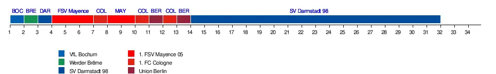 | Bochum | 18 | 14 | 13 | 13 | 14 | 16 | 16 | 17 | 16 | 14 | 14 | 14 | 12 | 14 | 13 | 14 | 14 | 14 | 14 | 14 | 14 | 11 | 15 | 15 | 15 | 15 | 15 | 15 | 15 | - | - | - | - | - | - | 3 | 2 |