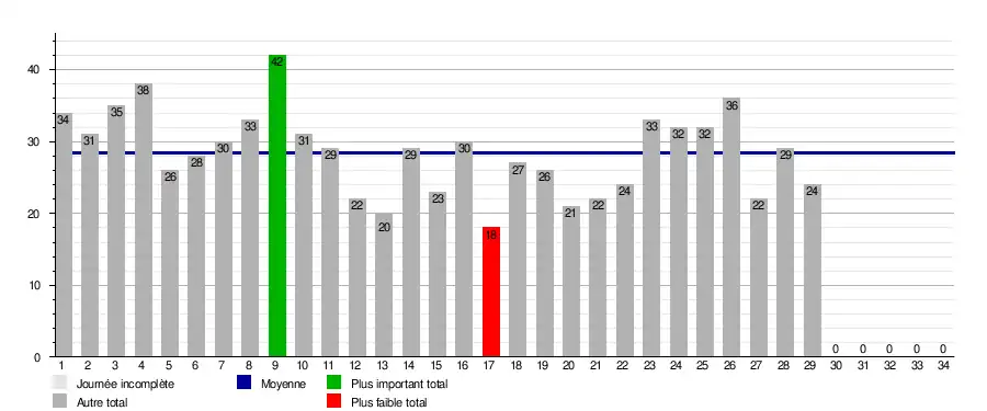 | Journée → | 1 | 2 | 3 | 4 | 5 | 6 | 7 | 8 | 9 | 10 | 11 | 12 | 13 | 14 | 15 | 16 | 17 | 18 | 19 | 20 | 21 | 22 | 23 | 24 | 25 | 26 | 27 | 28 | 29 | 30 | 31 | 32 | 33 | 34 | Journées en tête | Journées barragiste | Journées relégable |