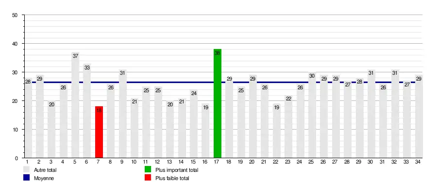 | Journée → | 1 | 2 | 3 | 4 | 5 | 6 | 7 | 8 | 9 | 10 | 11 | 12 | 13 | 14 | 15 | 16 | 17 | 18 | 19 | 20 | 21 | 22 | 23 | 24 | 25 | 26 | 27 | 28 | 29 | 30 | 31 | 32 | 33 | 34 |