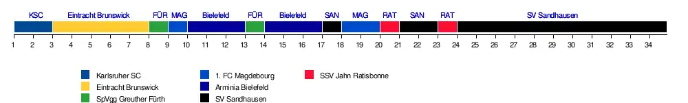 | Sandhausen | 5 | 10 | 6 | 10 | 14 | 14 | 13 | 13 | 15 | 15 | 11 | 15 | 16 | 17 | 15 | 16 | 18 | 12 | 15 | 17 | 18 | 18 | 17 | 18 | 18 | 18 | 18 | 18 | 18 | 18 | 18 | 18 | 18 | 18 |