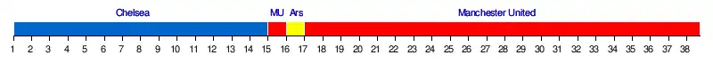 | Résultats (▼dom., ►ext.) | Ars | Ast | Bir | BRo | Bla | Bol | Che | Eve | Ful | Liv | MCi | MUn | New | Sto | Sun | Tot | WBA | WeH | Wig | Wol |