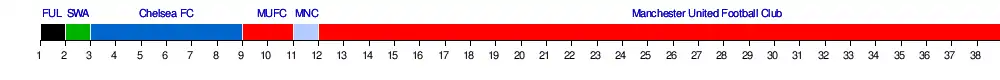 | Chelsea | 4 | 2 | 1 | 1 | 1 | 1 | 1 | 1 | 1 | 2 | 3 | 3 | 4 | 3 | 3 | 3 | 3 | 3 | 3 | 3 | 4 | 3 | 3 | 3 | 3 | 3 | 4 | 4 | 4 | 3 | 4 | 3 | 4 | 4 | 3 | 3 | 3 | 3 | 7 | 0 |