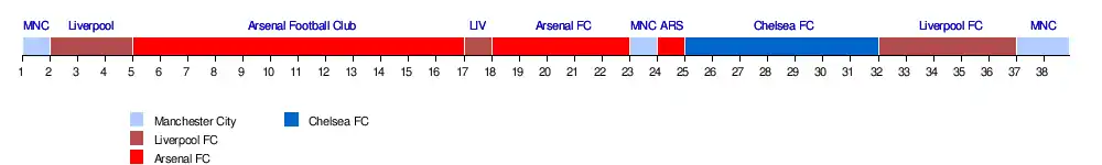 | Chelsea | 4 | 4 | 2 | 6 | 4 | 5 | 3 | 2 | 2 | 2 | 4 | 3 | 2 | 2 | 3 | 3 | 4 | 3 | 3 | 3 | 3 | 3 | 3 | 3 | 1 | 1 | 1 | 1 | 1 | 1 | 1 | 2 | 2 | 2 | 2 | 2 | 3 | 3 | 7 | |