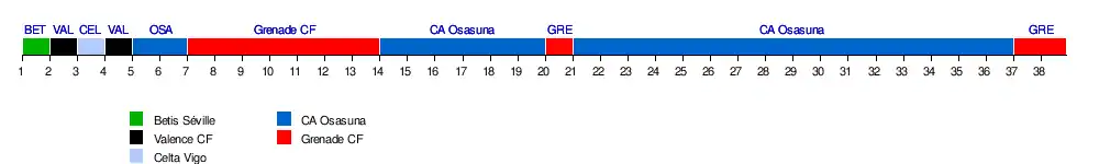 | FC Barcelone | 1 | 2 | 5 | 2 | 3 | 2 | 4 | 4 | 3 | 2 | 2 | 2 | 2 | 2 | 2 | 2 | 3 | 3 | 3 | 2 | 2 | 2 | 2 | 2 | 1 | 1 | 2 | 2 | 2 | 2 | 2 | 2 | 1 | 1 | 1 | 1 | 2 | 2 | 7 | |