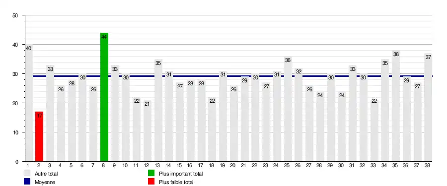 | Journée → | 1 | 2 | 3 | 4 | 5 | 6 | 7 | 8 | 9 | 10 | 11 | 12 | 13 | 14 | 15 | 16 | 17 | 18 | 19 | 20 | 21 | 22 | 23 | 24 | 25 | 26 | 27 | 28 | 29 | 30 | 31 | 32 | 33 | 34 | 35 | 36 | 37 | 38 | 1er | Rel. |