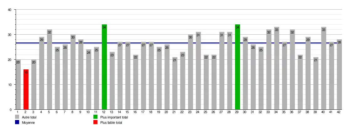 | Journée → | 1 [e 1] | 2 [e 2] | 3 | 4 | 5 | 6 | 7 | 8 | 9 | 10 | 11 | 12 | 13 | 14 | 15 | 16 | 17 | 18 | 19 | 20 | 21 [r 1] | 22 | 23 | 24 | 25 | 26 | 27 | 28 | 29 | 30 | 31 | 32 | 33 | 34 | 35 | 36 | 37 | 38 | 39 | 40 | 41 | 42 |