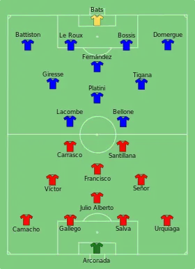 | Bats - Battiston, Bossis, Le Roux, Domergue - Fernandez, Tigana, Platini, Giresse - Lacombe ( | Équipes | Bento - Pinto, Lima Pereira, Eurico, Álvaro - Frasco, Sousa ( | ||||||||||||||||||||||