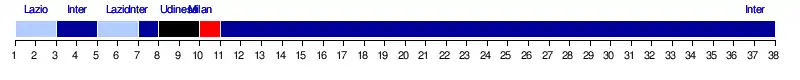 | Inter Milan | 9 | 4 | 1 | 1 | 4 | 3 | 1 | 2 | 4 | 3 | 1 | 1 | 1 | 1 | 1 | 1 | 1 | 1 | 1 | 1 | 1 | 1 | 1 | 1 | 1 | 1 | 1 | 1 | 1 | 1 | 1 | 1 | 1 | 1 | 1 | 1 | 1 | 1 | 31 | |