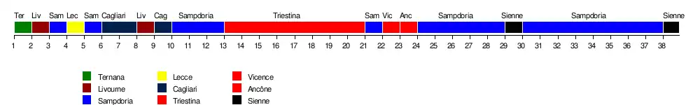 | Cagliari Calcio | 2-1 | 1-0 | 1-0 | 1-2 | 3-0 | 1-0 | 1-1 | 1-1 | 0-2[1] | 2-2 | 2-2 | 2-0 | 1-0 | 2-3 | 1-1 | 2-0 | 1-0 | 2-1 | 3-0 | |