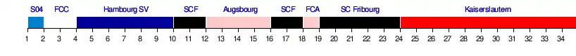 | VfB Stuttgart | 1 | 3 | 10 | 12 | 10 | 6 | 7 | 7 | 4 | 5 | 6 | 7 | 6 | 7 | 7 | 7 | 8 | 10 | 10 | 11 | 9 | 9 | 8 | 8 | 8 | 8 | 7 | 6 | 5 | 5 | 5 | 5 | 6 | 6 | 1 | 0 |