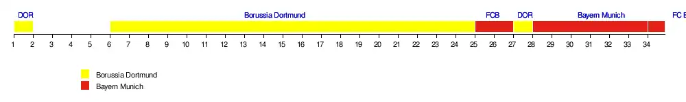 | Dortmund | 1 | 4 | 2 | 3 | 2 | 1 | 1 | 1 | 1 | 1 | 1 | 1 | 1 | 1 | 1 | 1 | 1 | 1 | 1 | 1 | 1 | 1 | 1 | 1 | 2 | 2 | 1 | 2 | 2 | 2 | 2 | 2 | 2 | 2 | 21 | 0 | 0 |