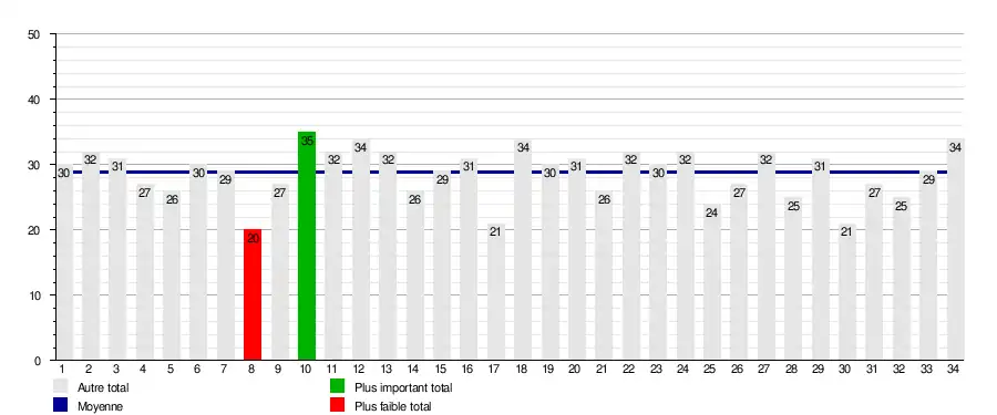 | Journée → | 1 | 2 | 3 | 4 | 5 | 6 | 7 | 8 | 9 | 10 | 11 | 12 | 13 | 14 | 15 | 16 | 17 | 18 | 19 | 20 | 21 | 22 | 23 | 24 | 25 | 26 | 27 | 28 | 29 | 30 | 31 | 32 | 33 | 34 | Journées en tête | Journées barragiste | Journées relégable |