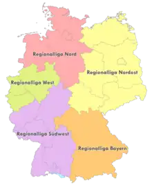 - Depuis 2012-2013 - La Regionalliga correspond au niveau 4 du football allemand (5 séries distinctes: Nord, Nord-Est, Ouest, Sud et Bavière).