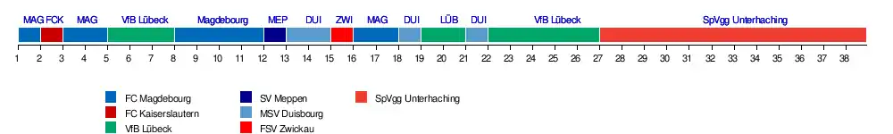 | Unterhaching | 15 | 11 | 5 | 3 | 5 | 11 | 13 | 16 | 16 | 18 | 17 | 17 | 17 | 16 | 14 | 14 | 14 | 15 | 15 | 16 | 17 | 17 | 17 | 18 | 18 | 18 | 19 | 20 | 20 | 20 | 20 | 20 | 20 | 20 | 20 | 20 | 20 | 20 |