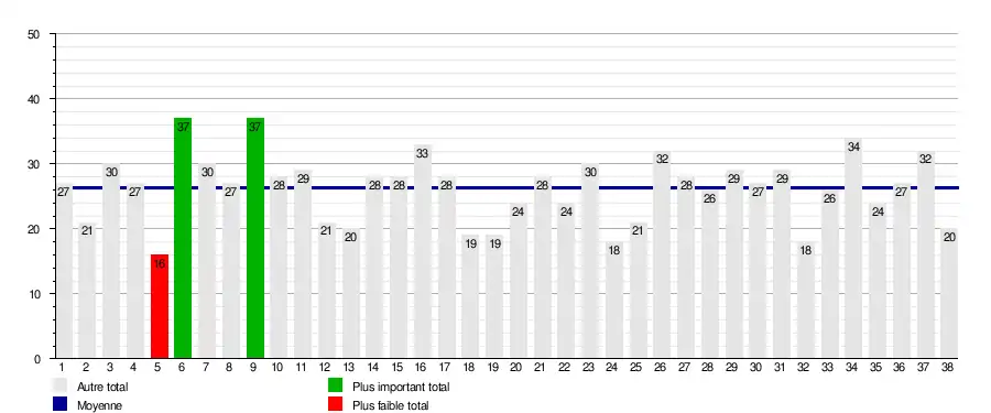 | Journée → | 1 | 2 | 3 | 4 | 5 | 6 | 7 | 8 | 9 | 10 | 11 | 12 | 13 | 14 | 15 | 16 | 17 | 18 | 19 | 20 | 21 | 22 | 23 | 24 | 25 | 26 | 27 | 28 | 29 | 30 | 31 | 32 | 33 | 34 | 35 | 36 | 37 | 38 |