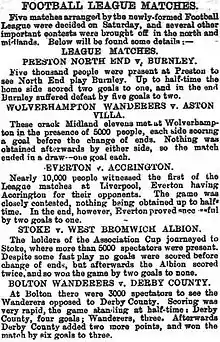Le est le premier jour du premier championnat de football de l'histoire. Ce jour-là cinq matchs sont disputés et 24 000 personnes ont assisté à 23 buts[M 15]. Preston bat Burnley sur le score de 5 buts à 2, Bolton est défait à domicile par Derby 6 à 2, Everton domine Accrington 2 à 1 et West Bromwich l'emporte à Stoke 2 à 0.
