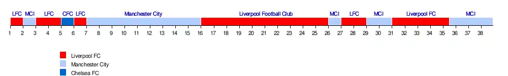 | Man. City | 5 | 1 | 5 | 4 | 3 | 2 | 1 | 1 | 1 | 1 | 1 | 1 | 1 | 1 | 1 | 2 | 2 | 2 | 3 | 2 | 2 | 2 | 2 | 2 | 2 | 1 | 2 | 2 | 1 | 1 | 2 | 2 | 2 | 2 | 2 | 1 | 1 | 1 | 16 | |
