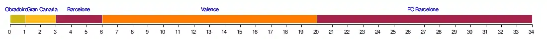 | Barcelone | 6 | 2 | 2 | 1 | 1 | 1 | 2 | 2 | 2 | 3 | 3 | 3 | 2 | 2 | 2 | 2 | 2 | 2 | 2 | 2 | 1 | 1 | 1 | 1 | 1 | 1 | 1 | 1 | 1 | 1 | 1 | 1 | 1 | 1 |
