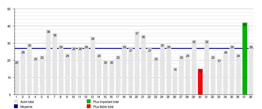 | Journée → | 1 | 2 | 3 | 4 | 5 | 6 | 7 | 8 | 9 | 10 | 11 | 12 | 13 | 14 | 15 | 16 | 17 | 18 | 19 | 20 | 21 | 22 | 23 | 24 | 25 | 26 | 27 | 28 | 29 | 30 | 31 | 32 | 33 | 34 | 35 | 36 | 37 | 38 | Journées en tête | Journées relégable |