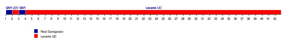 | Saragosse | 1 | 3 | 1 | 2 | 2 | 4 | 6 | 7 | 8 | 14 | 15 | 9 | 11 | 6 | 10 | 13 | 14 | 11 | 8 | 11 | 13 | 14 | 15 | 12 | 14 | 14 | 14 | 13 | 14 | 15 | 14 | 13 | 12 | 11 | 11 | 11 | 14 | 13 | 13 | 15 | 13 | 16 |