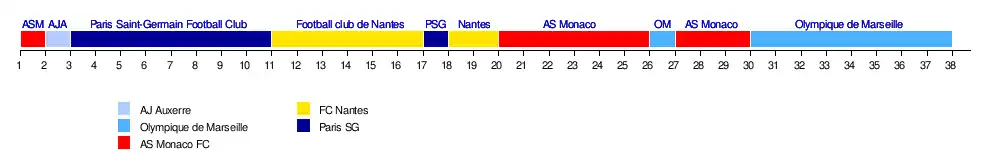 | AS Monaco | 4-0 | 0-0 | 4-2 | 2-0 | 2-1 | 3-0 | 2-1 | 1-0 | 2-0 | 0-0 | 3-1 | 3-1 | 3-1 | 1-0 | 1-0 | 2-1 | 4-0 | 4-0 | 2-1 | |
