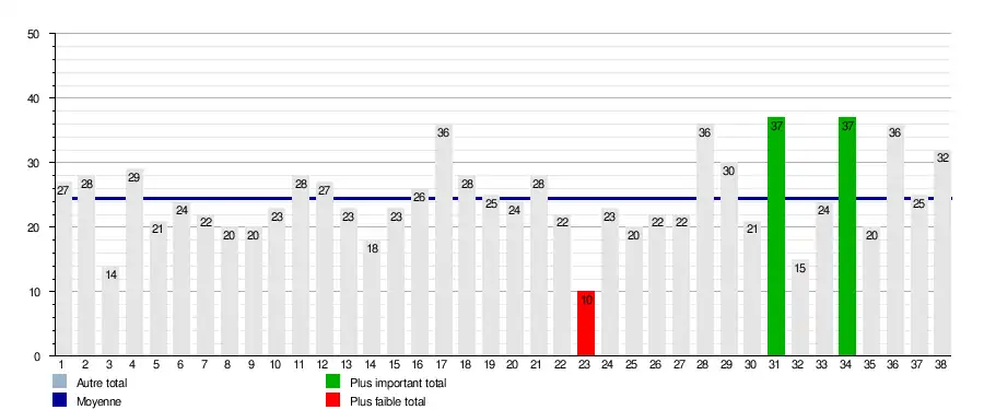 | Journées → | 1 | 2 | 3 | 4 | 5 | 6 | 7 | 8 | 9 | 10 | 11 | 12 | 13 | 14 | 15 | 16 | 17 | 18 | 19 | 20 | 21 | 22 | 23 | 24 | 25 | 26 | 27 | 28 | 29 | 30 | 31 | 32 | 33 | 34 | 35 | 36 | 37 | 38 | En tête | Relégable |