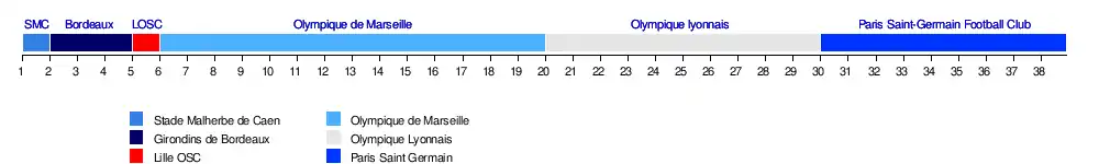| Marseille | 8 | 15 | 10 | 4 | 2 | 1 | 1 | 1 | 1 | 1 | 1 | 1 | 1 | 1 | 1 | 1 | 1 | 1 | 1 | 2 | 2 | 2 | 2 | 2 | 2 | 3 | 3 | 3 | 3 | 3 | 3 | 4 | 4 | 5 | 4 | 4 | 4 | 4 | 14 | |