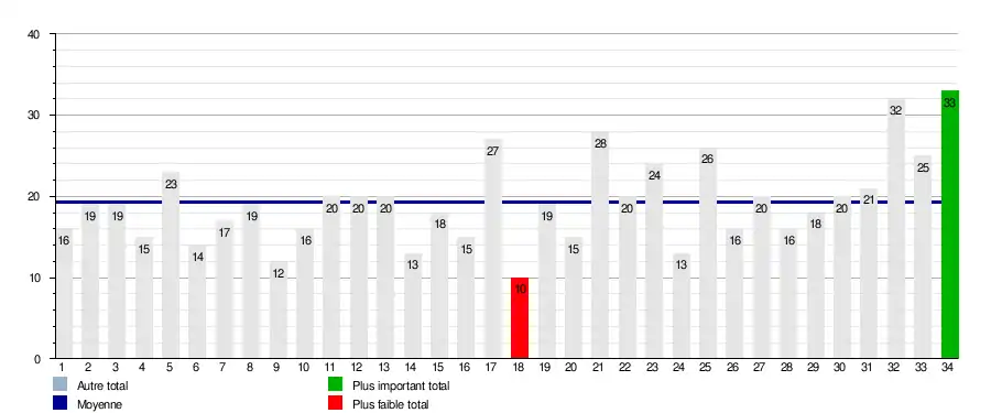 | Luçon VF | 7 | 13 | 16 | 9 | 11 | 14 | 14 | 12 | 10 | 11 | 9 | 11 | 11 | 12 | 12 | 13 | 15 | 15 | 15 | 15 | 15 | 15 | 14 | 14 | 15 | 15 | 13 | 13 | 14 | 13 | 13 | 14 | 13 | 12 | 9 |