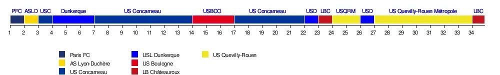 | Paris FC | 1 | 9 | 9 | 10 | 11 | 11 | 11 | 12 | 13 | 13 | 14 | 15 | 16 | 15 | 17 | 16 | 13 | 11 | 10 | 9 | 10 | 11 | 11 | 10 | 10 | 8 | 10 | 10 | 7 | 8 | 6 | 4 | 4 | 3 | 2 | 5 |