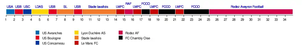 | Rodez | 7 | 15 | 15 | 10 | 12 | 11 | 7 | 5 | 5 | 5 | 2 | 3 | 7 | 3 | 1 | 3 | 3 | 3 | 3 | 3 | 2 | 3 | 2 | 2 | 1 | 1 | 1 | 1 | 1 | 1 | 1 | 1 | 1 | 1 | 23 | 2 |