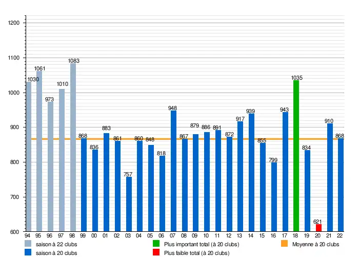 Total de 20 795 buts en 23 saisons (2021-2022 inclus) soit 866 buts de moyenne chaque saison