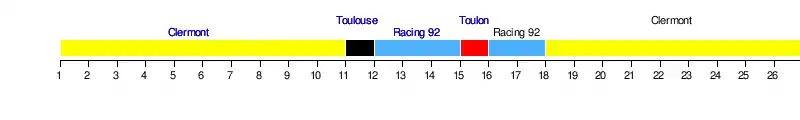 | Racing 92 | 6 | 3 | 5 | 4 | 4 | 3 | 2 | 3 | 2 | 4 | 2 | 1 | 1 | 1 | 2 | 1 | 1 | 2 | 4 | 3 | 4 | 3 | 4 | 4 | 4 | 4 |