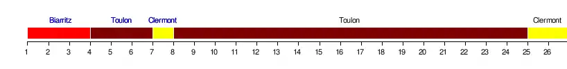 | ASM Clermont | 66-21 | 48-3 | 19-12 | 67-3 | 37-10 | 44-20 | 56-3 | 36-18 | 28-25 | 53-31 | 13-12 | 24-21 | 39-17 | |