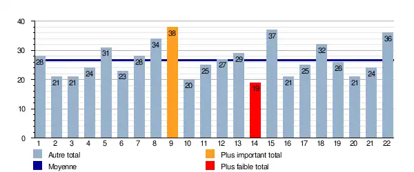 Ce graphique représente le nombre de buts marqués lors de chaque journée. Il est également indiqué la moyenne totale sur la saison qui est de 26,81 buts/journée.