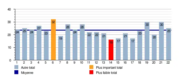 Ce graphique représente le nombre de buts marqués lors de chaque journée. Il est également indiqué la moyenne total sur la saison qui est de 23,59 buts/journée.