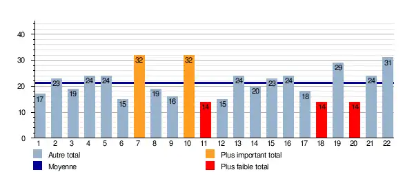 Ce graphique représente le nombre de buts marqués lors de chaque journée. Il est également indiqué la moyenne totale sur la saison qui est de 21,4 buts/journée.
