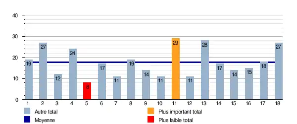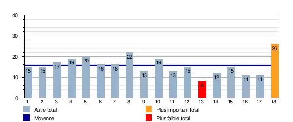 Ce graphique représente le nombre de buts marqués lors de chaque journée pour le groupe A. Il est également indiqué la moyenne total sur la saison qui est de 17,83 buts/journée.