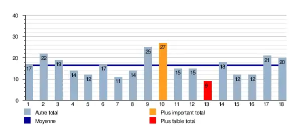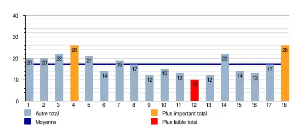 Ce graphique représente le nombre de buts marqués lors de chaque journée pour le groupe A. Il est également indiqué la moyenne total sur la saison qui est de 17,38 buts/journée.
