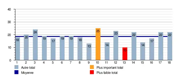 Ce graphique représente le nombre de buts marqués lors de chaque journée pour le groupe B. Il est également indiqué la moyenne total sur la saison qui est de 18,66 buts/journée.