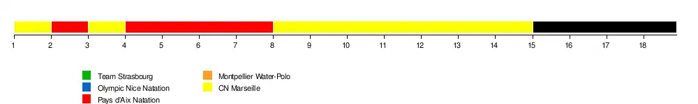 | Pays d'Aix Natation | 2 | 1 | 2 | 1 | 1 | 1 | 1 | 2 | 2 | |||||||||||