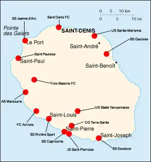 | 14 | Trois-Bassins FC | 46 | 26 | 18 | -31 |