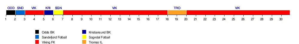 | Rosenborg | 1 | 1 | 2 | 1 | 1 | 1 | 1 | 1 | 1 | 1 | 1 | 1 | 2 | 1 | 1 | 1 | 1 | 1 | 1 | 1 | 1 | 1 | 1 | 1 | 1 | 1 | 1 | 1 | 1 | 1 | 28 | |
