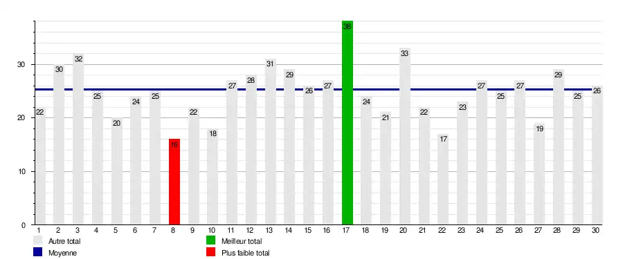 | Journée ? | 1 | 2 | 3 | 4 | 5 | 6 | 7 | 8 | 9 | 10 | 11 | 12 | 13 | 14 | 15 | 16 | 17 | 18 | 19 | 20 | 21 | 22 | 23 | 24 | 25 | 26 | 27 | 28 | 29 | 30 | Journées en tête | Journées relégable |