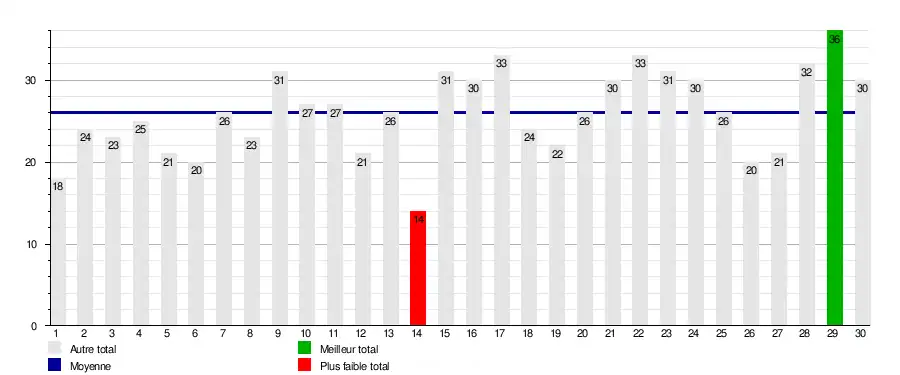 | Journée | 1 | 2 | 3 | 4 | 5 | 6 | 7 | 8 | 9 | 10 | 11 | 12 | 13 | 14 | 15 | 16 | 17 | 18 | 19 | 20 | 21 | 22 | 23 | 24 | 25 | 26 | 27 | 28 | 29 | 30 | Journées en tête | Journées relégable |