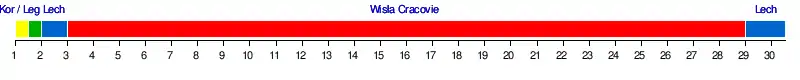 - 29e journée : En trois minutes, le Lech Poznań passe en tête au classement, profitant de l'égalisation du KS Cracovia et prenant l'avantage lors du temps additionnel contre le Ruch Chorzów grâce à Sergueï Krivets. Victorieux après vingt-et-un ans de disette à Chorzów[9], Poznań met fin à vingt-six journées de "leadership" du Wisla.