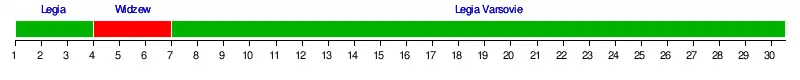 À l'issue de la 28e journée, profitant d'une défaite de son concurrent direct, le Lech Poznań, le Legia Varsovie remporte son neuvième titre de champion de Pologne, possédant six points d'avance et la différence particulière sur le Lech à deux journées de la fin. Le Legia réalise ainsi le doublé coupe-championnat, chose qui n'avait plus été faite en Pologne depuis dix ans et les victoires du Wisła Cracovie.